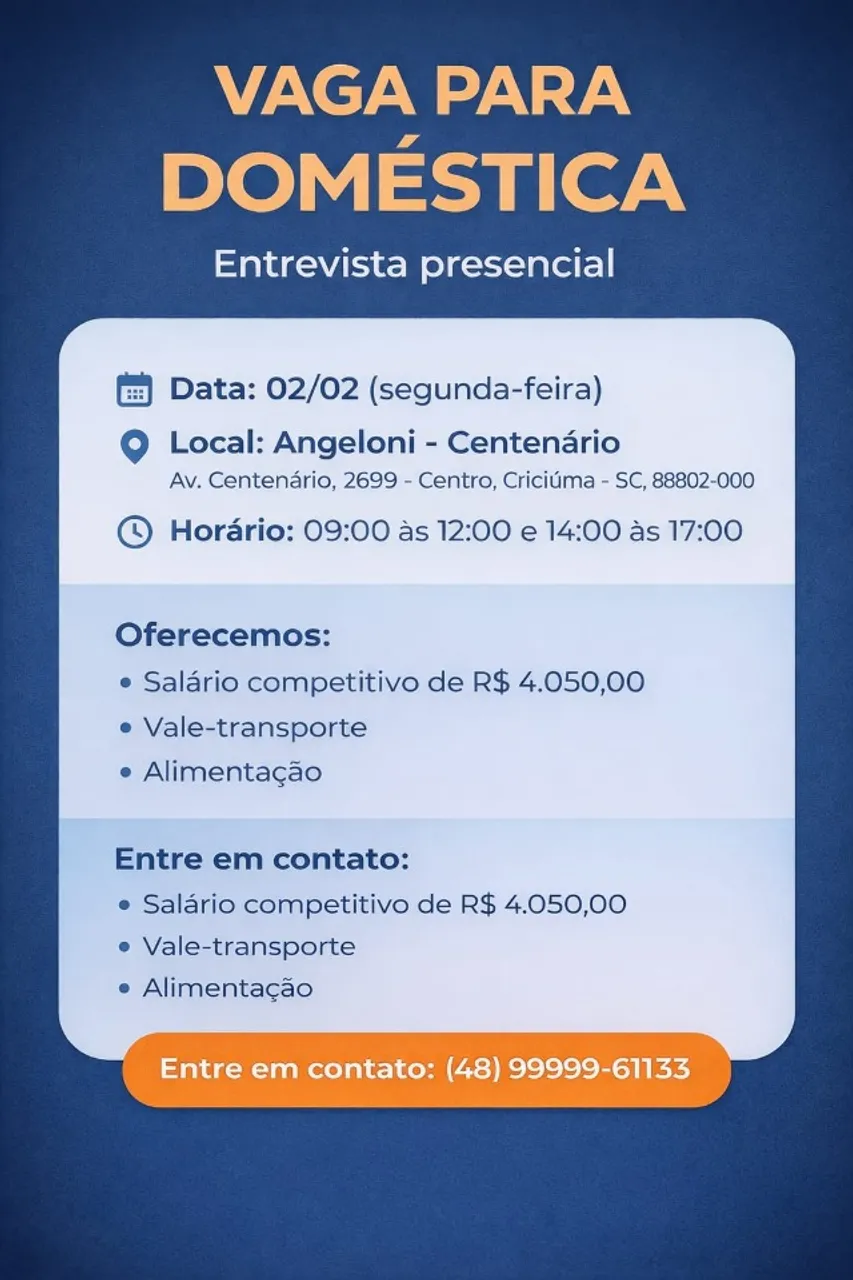 Atividades: Atuará como doméstica na residência da família. Sendo responsável por toda a limpeza, organização e no preparo das refeições quando necessário.