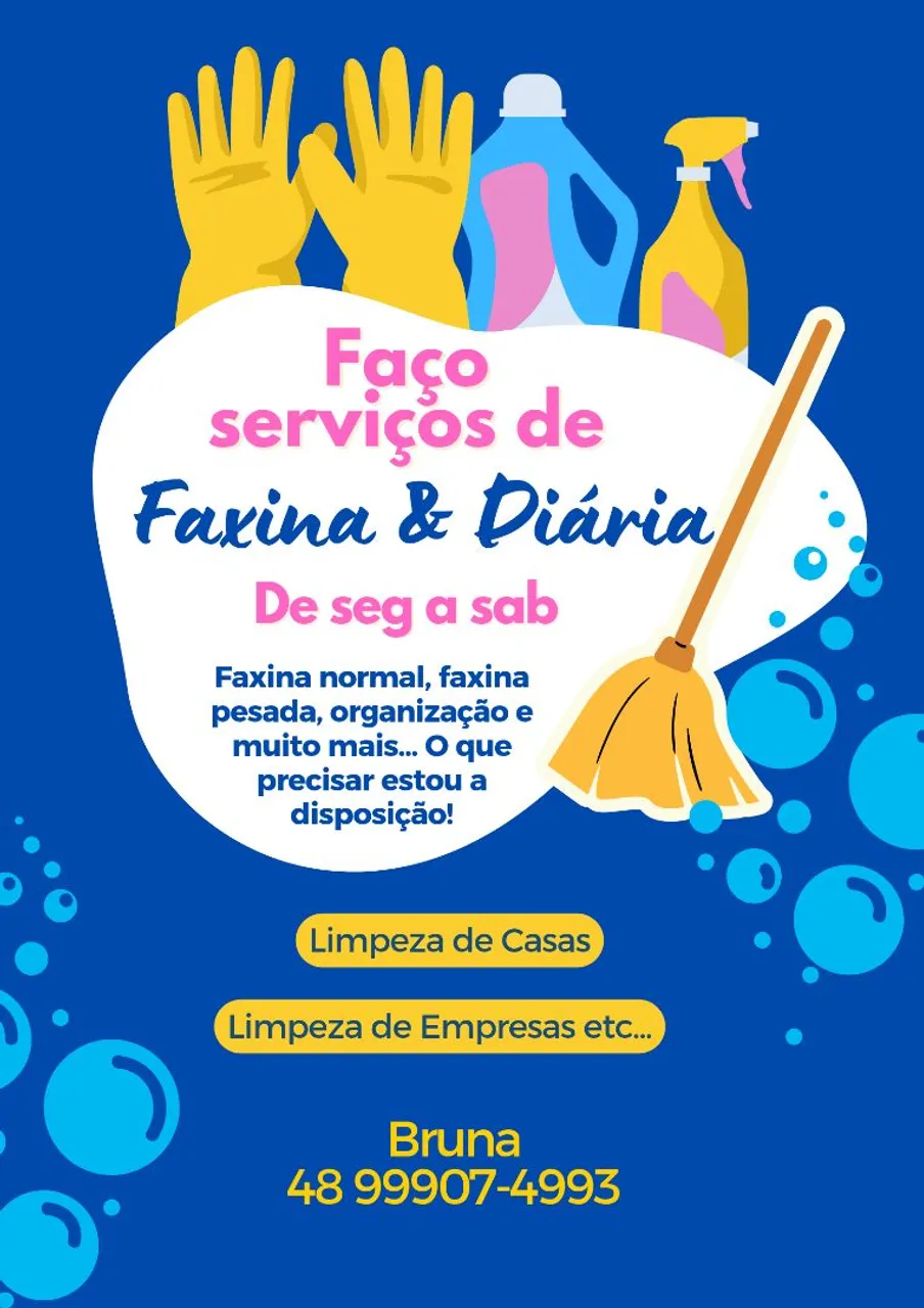 Olá estou oferecendo meus serviços, de faxina e diárias, trabalha eu e mais uma amiga. Preço justo, atendimento em toda a região de Imbituba, praia do rosa, Guaiúba, barra Ibiraquera Meu contato para mais informações