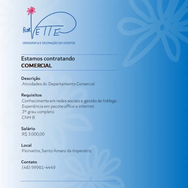 Somos uma empresa especializada em Cenografia e Decoração de Eventos Corporativos e buscamos um profissional para integrar nosso Setor Comercial.