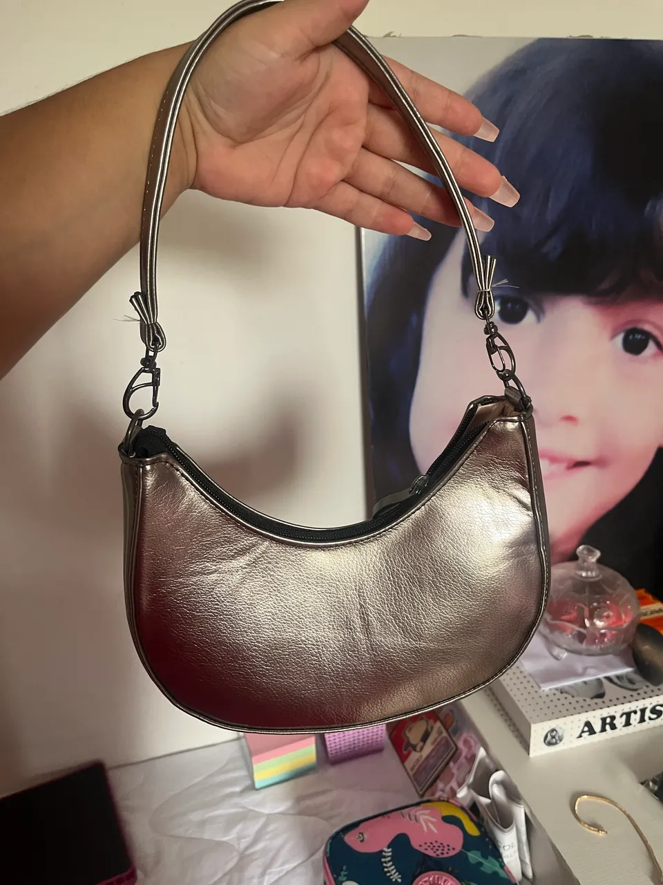 Linda bolsa modelo lua na cor prateada, perfeita para complementar seu look com elegância e estilo. Design moderno e sofisticado para te acompanhar em diversas ocasiões.