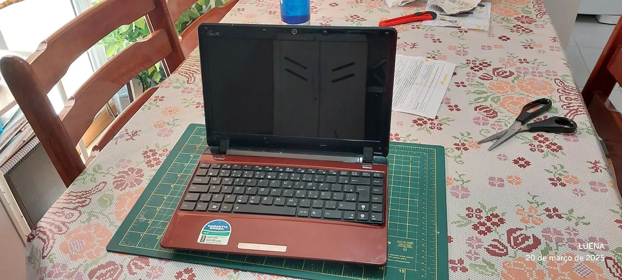 Notebook ASUS para aproveitar peças. Como sou hobbysta, adquiri este como passatempo tentando recuperar. A tela inicial inicia como na foto, mas logo apaga e não volta mais.