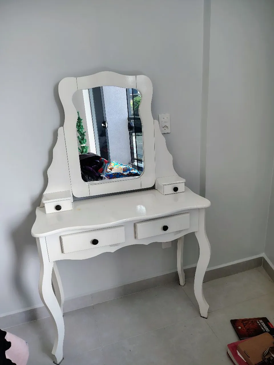 Linda penteadeira branca com espelho, perfeita para organizar seus cosméticos e dar um toque de charme ao seu quarto! Design elegante e funcional.