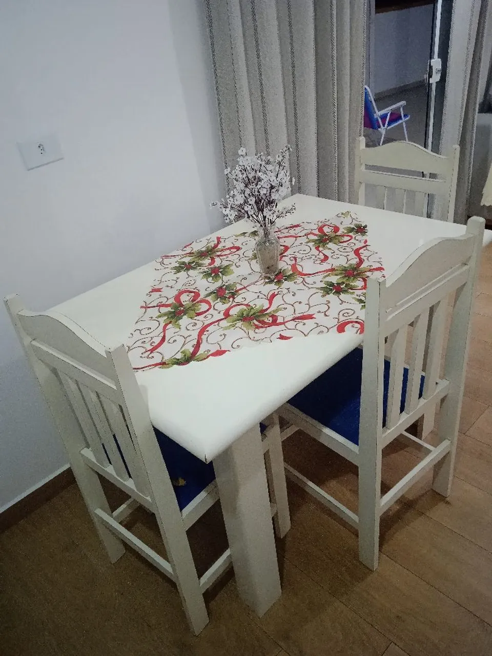 Mesa de madeira laqueada, com 3 cadeiras (com pequenas avarias no acento).