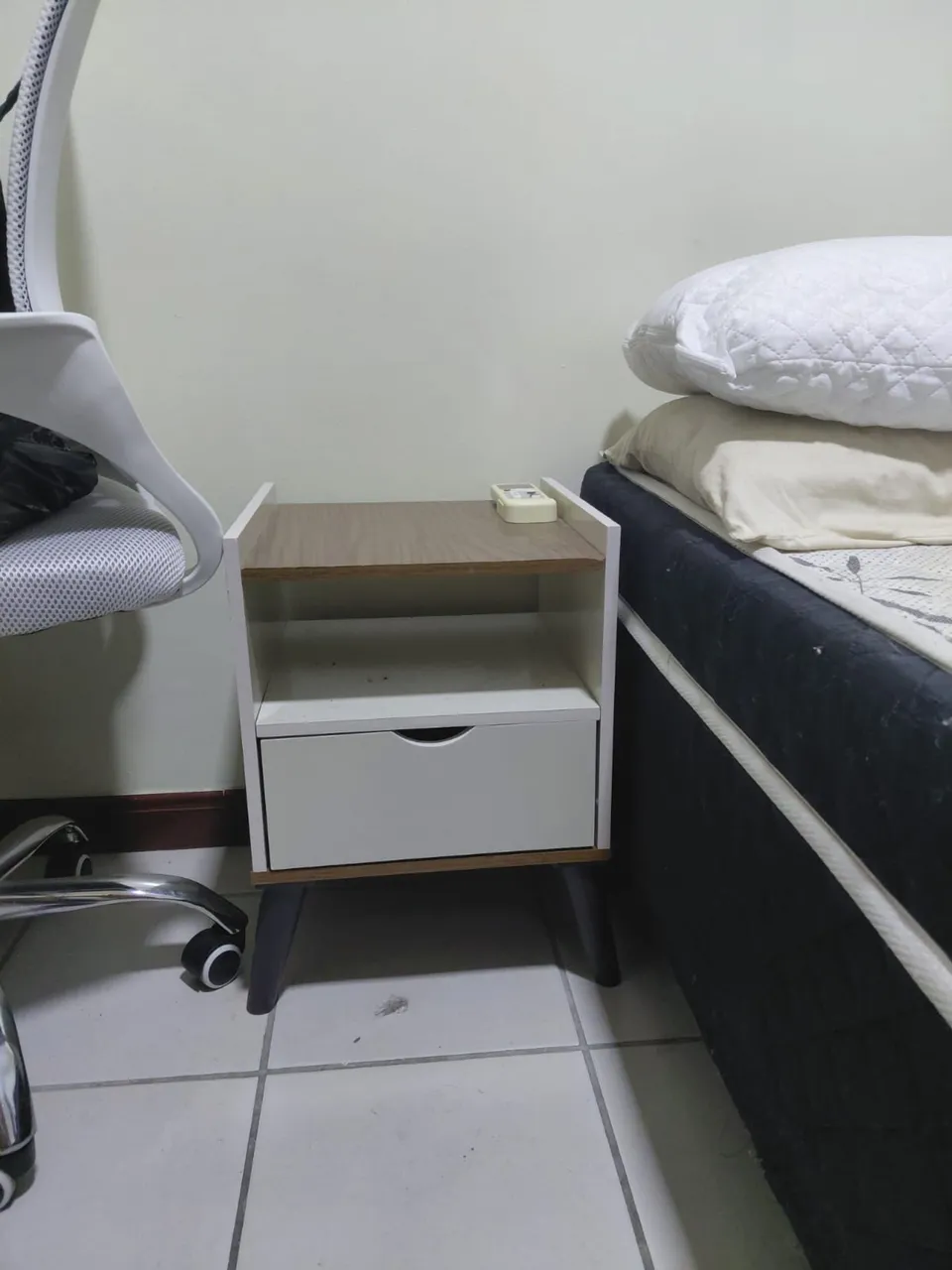 Mesa de cabeceira, gaveta veio quebrada, mas funciona. Só tô vendendo porque mudei de cidade e não compensa trazer. Comprei por 100, tô vendendo por 50. Usada por menos de um ano.
