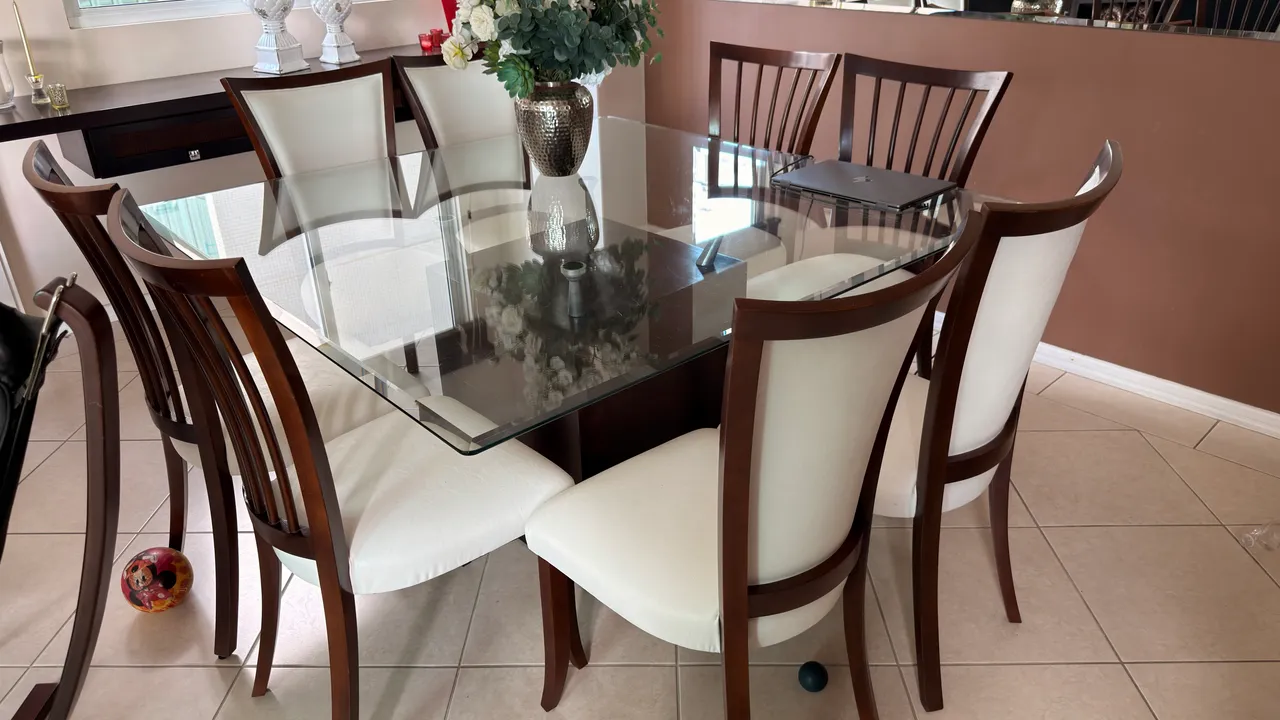 Pés de madeira, tampo de vidro bisotê tamanho 150x150, acompanha 8 cadeiras finamente estofadas.