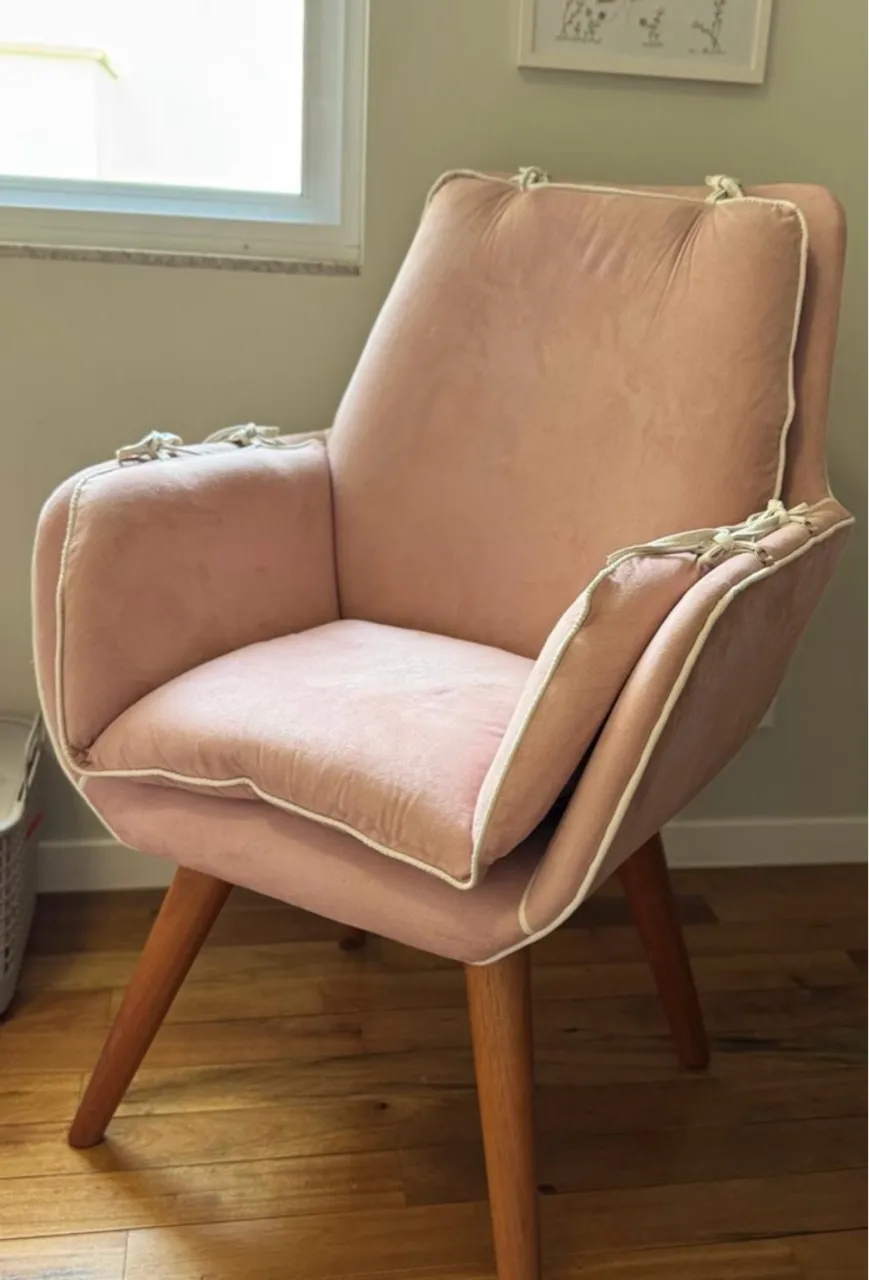 Linda poltrona de amamentação, na cor rose em veludo sem manchas no tecido . Acompanha puf de coração para apoiar os pés da mesma cor .