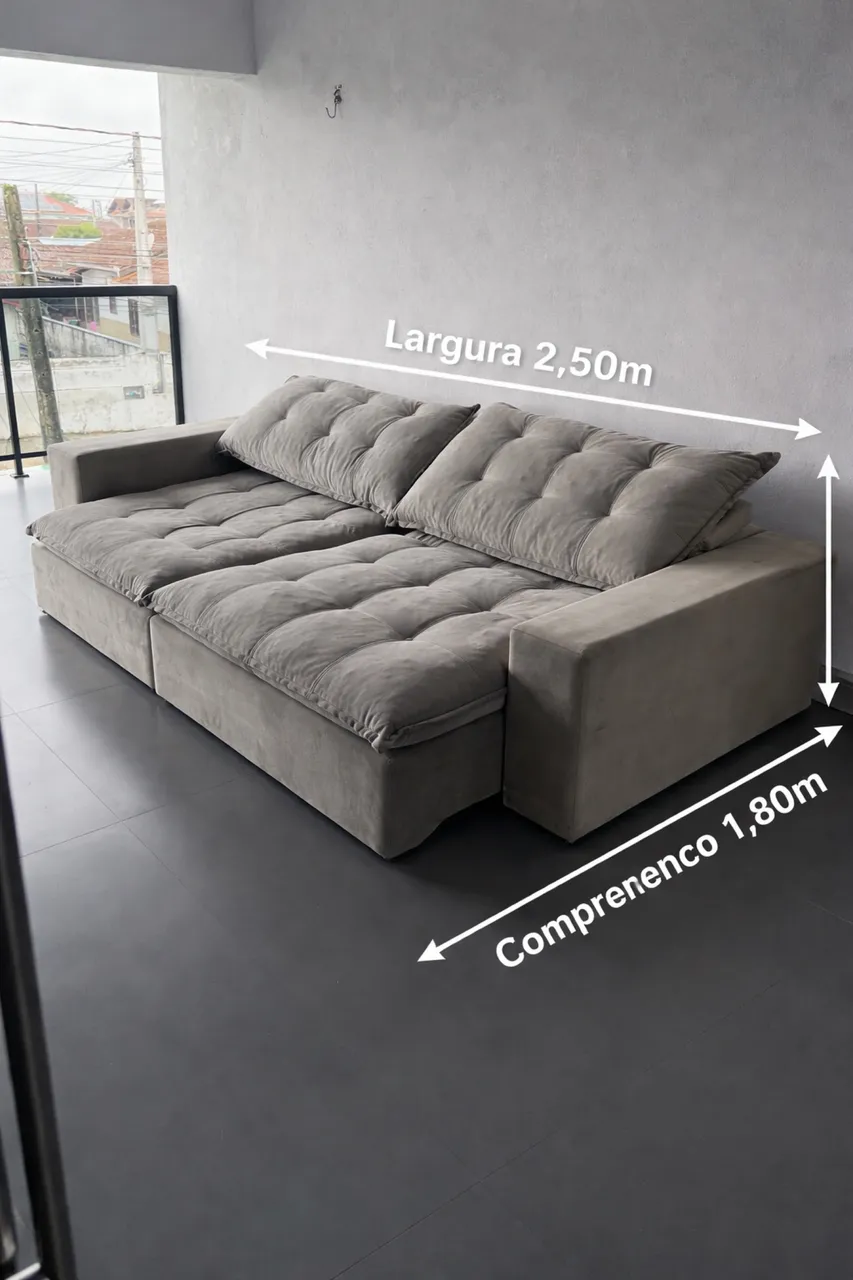 Sofá espaçoso e confortável, perfeito para relaxar e aproveitar momentos de descanso. Design moderno e elegante que se adapta a diversos ambientes.