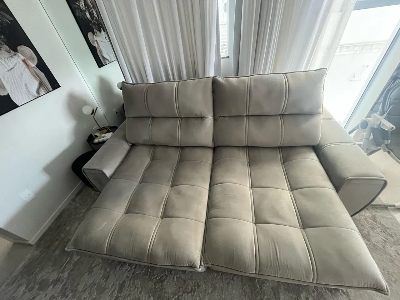 Aconchego e elegância para sua sala! Sofá de 3 lugares em suede bege, perfeito para relaxar e receber visitas. Design moderno e confortável, ideal para criar um ambiente agradável.