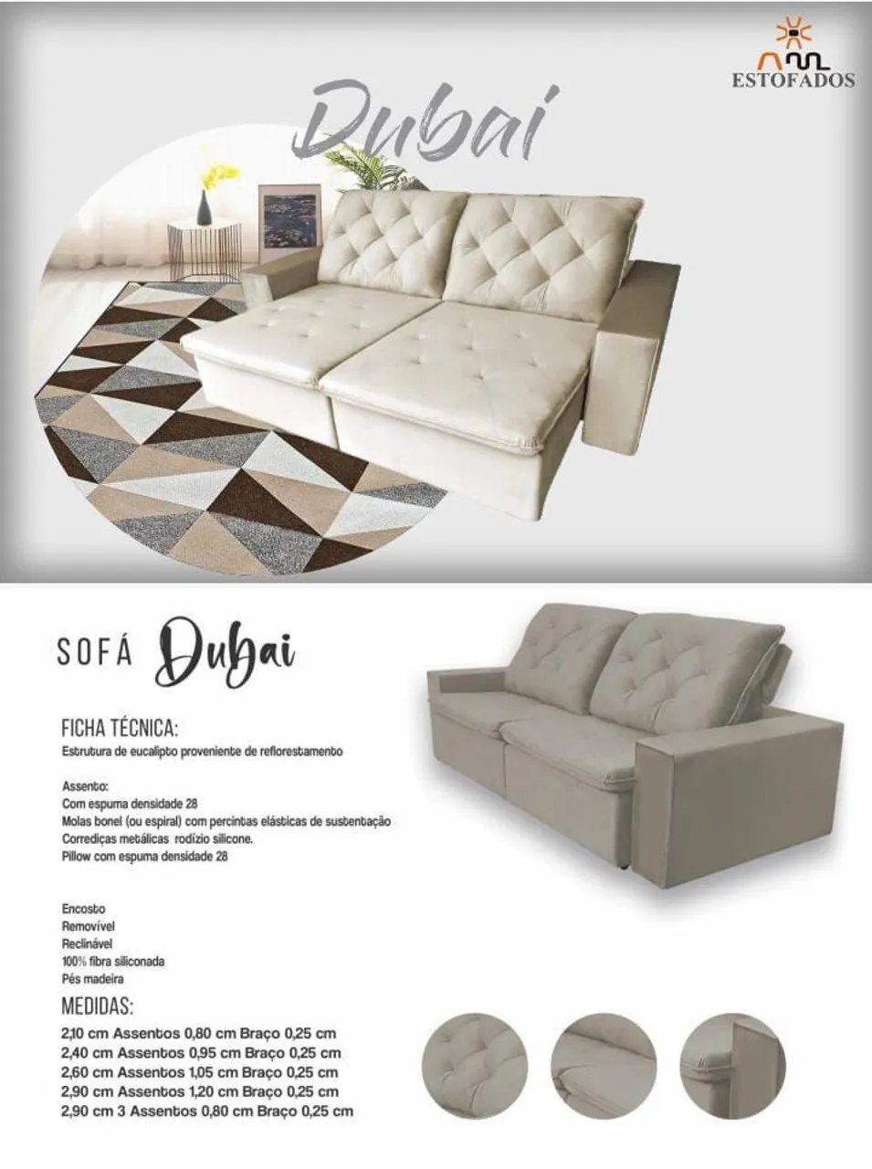 Sofá Dubai, design moderno com espuma de alta densidade e detalhes que garantem o seu conforto. Perfeito para relaxar e transformar seu ambiente. Possui encosto removível e reclinável.