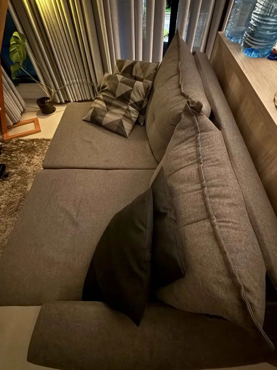 Desfrute de conforto e elegância com este sofá retrátil espaçoso. Perfeito para relaxar e receber convidados, este sofá oferece o espaço ideal para momentos de lazer. Cor cinza, sem danos ao tecido, almofada confortável, estrutura madeira, acompanha as almofadas. Não reclina, é apenas retrátil, tamanho cerca de 2,0m x 1,5 - 1,0m. BUSCAR NO ENDEREÇO, não entrego.