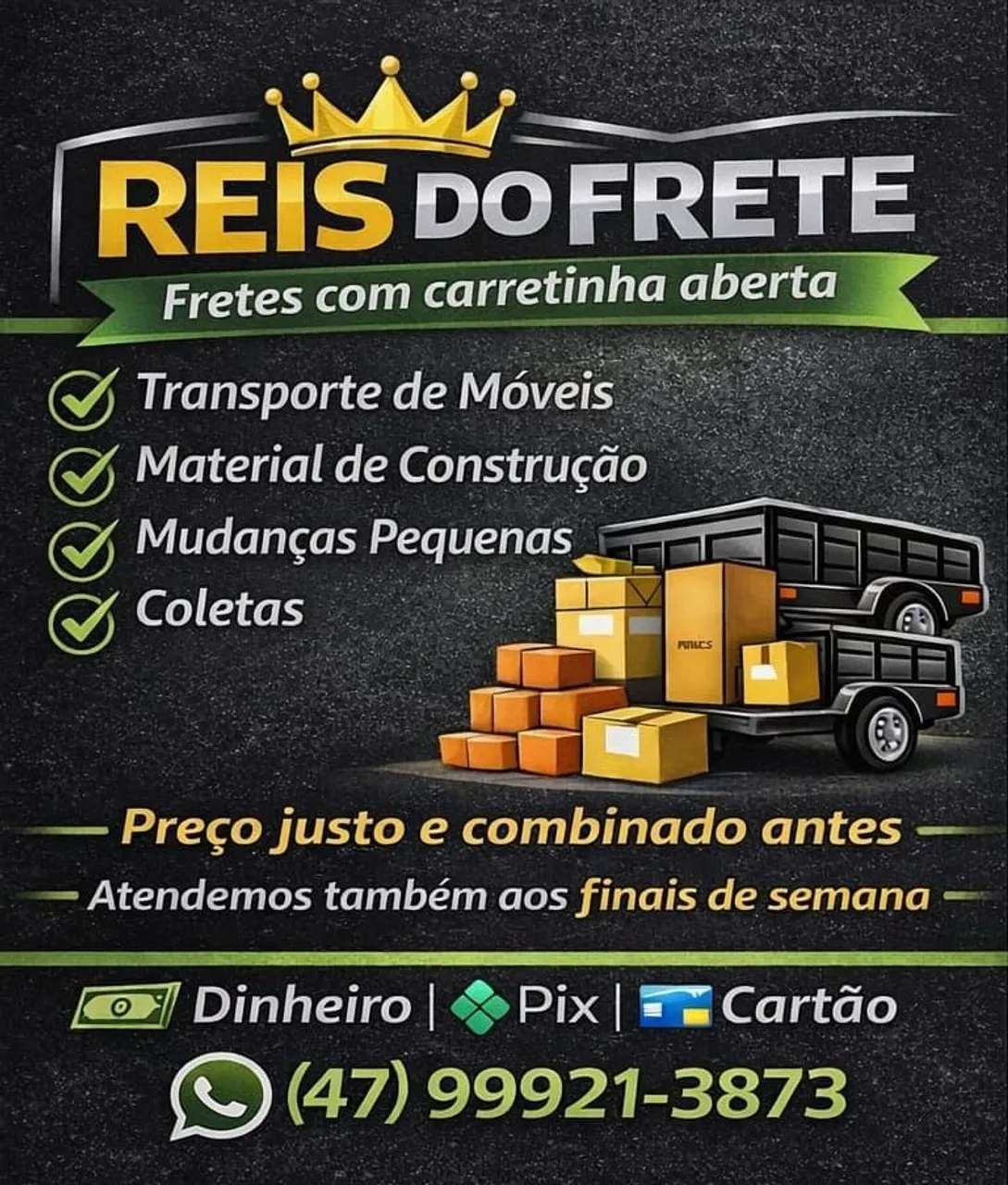 Frete com Carretinha Faço fretes com carretinha aberta para: ? Móveis ? Material de construção ?COLETAS ? Mudanças pequenas ? Atendemos Também aos Finais de Semana ? Preço justo e combinado antes ? WhatsApp: 0