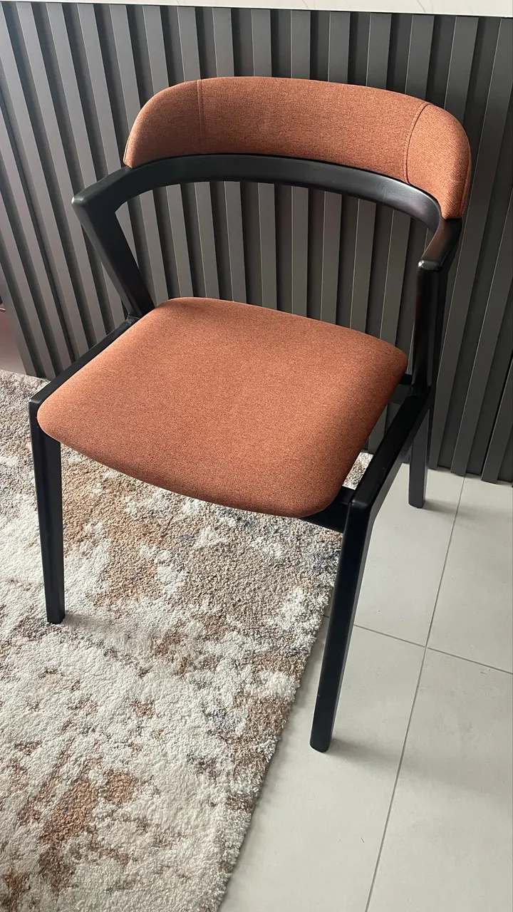 Cadeira estilo poltrona marca Finn madeira na cor preta e tecido terracota.